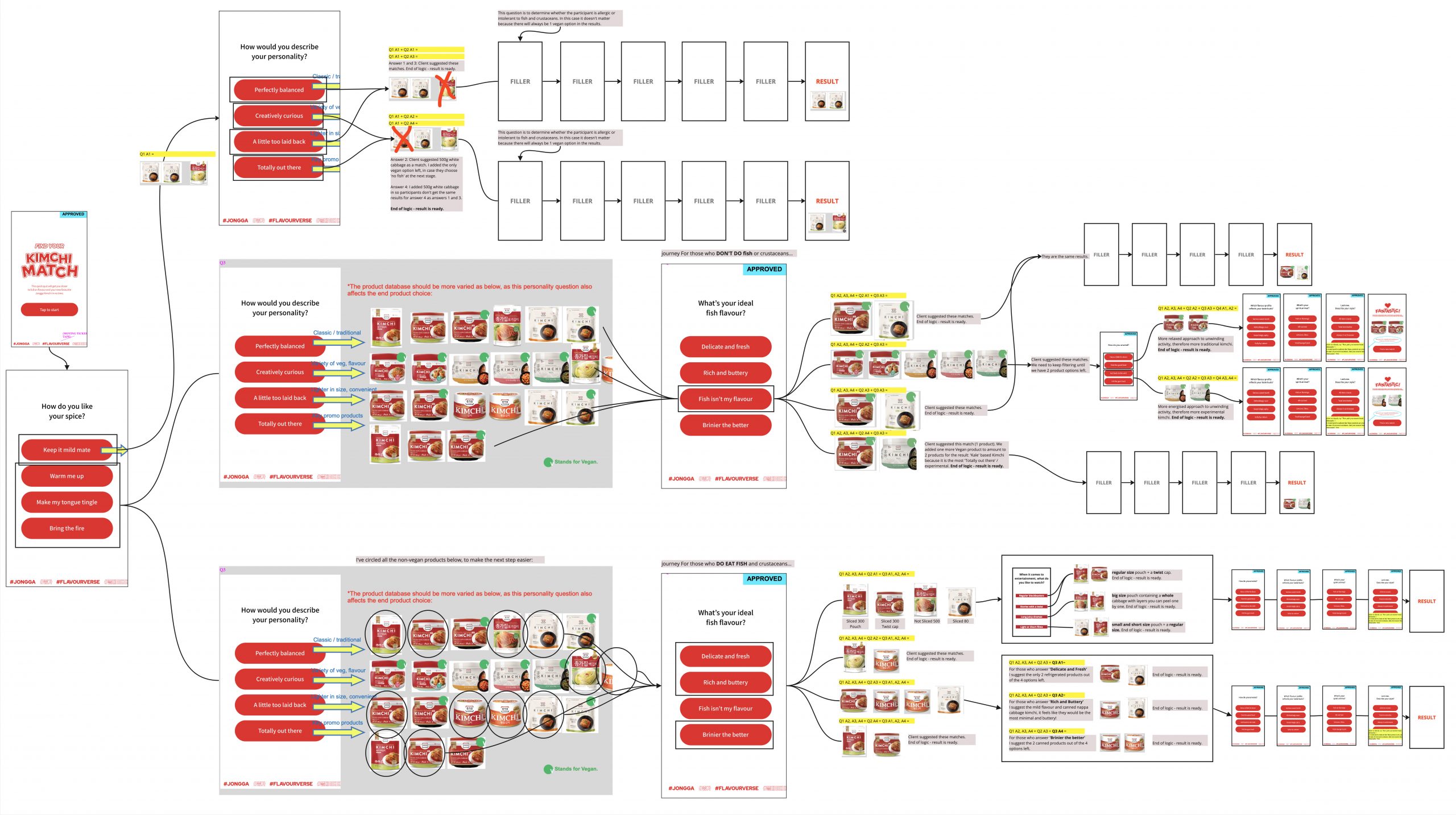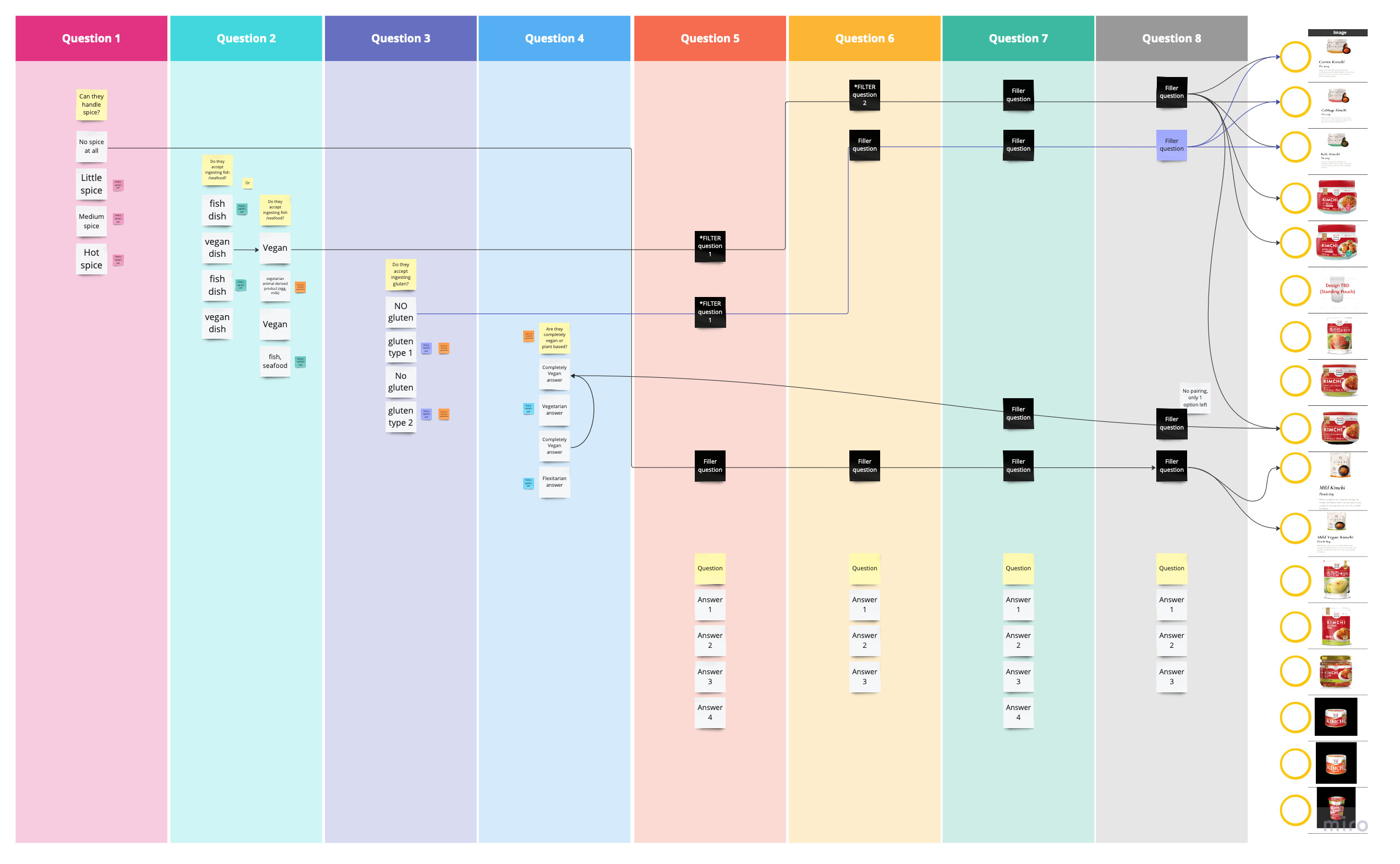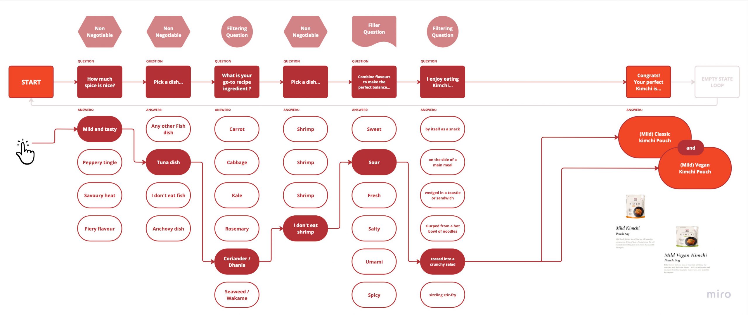 The team wasn’t sure how to translate 20+ products into the quiz, so I led by creating branching diagrams in Miro, mapping 4–6 answers per question to specific products. I first identified key differentiators (vegan, spice level, fish/shellfish) and iterated to ensure every path led to a logical pairing, while incorporating feedback from client and internal stakeholders.