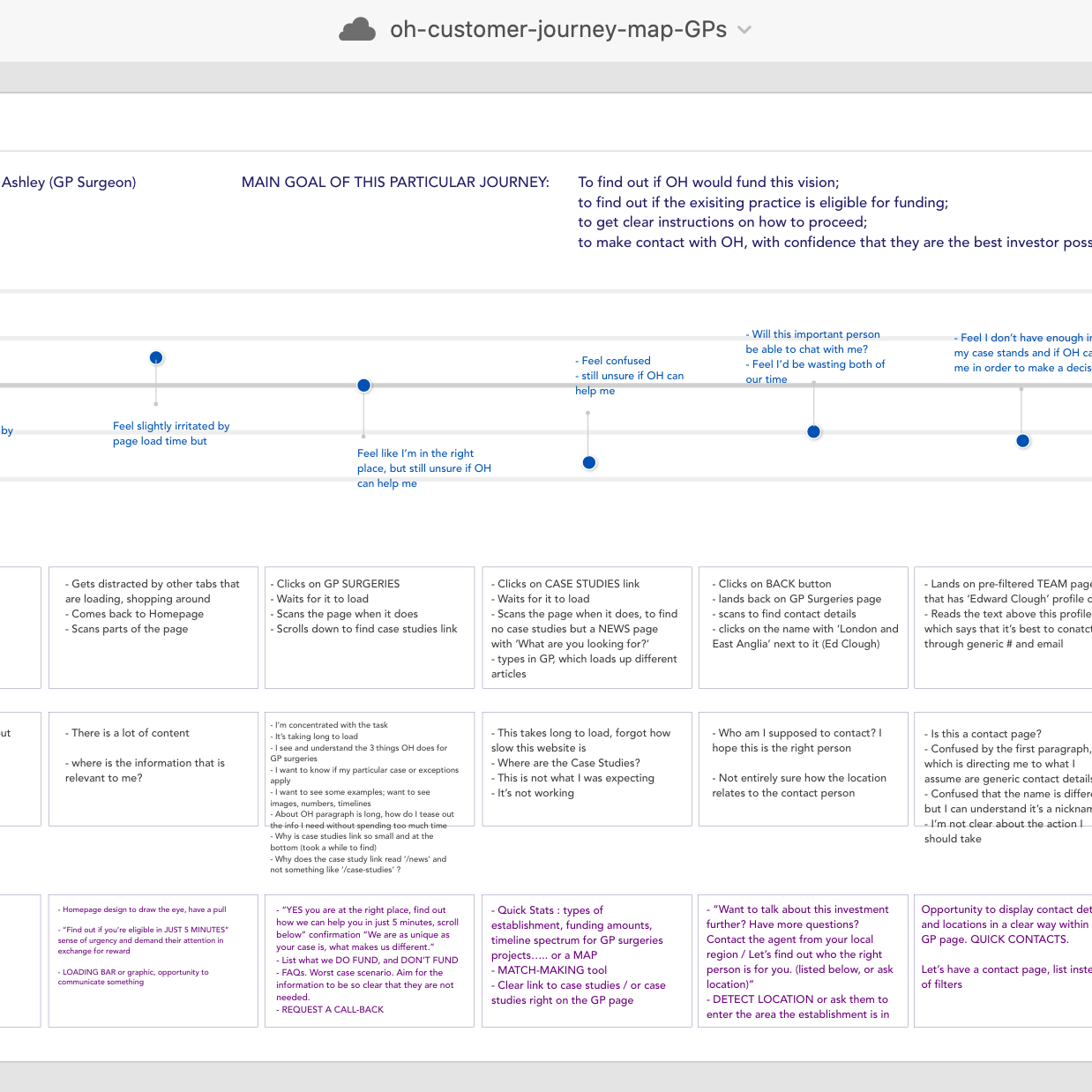 Individually: I compiled the Stakeholder Map, to help schedule workshops and plan future feedback sessions; I conducted a Usability Test of the previous website, which showcased problems online visitors were experiencing while trying to complete a task; I also drew up User Journeys and wrote persona-driven scenarios (see GP scenario).