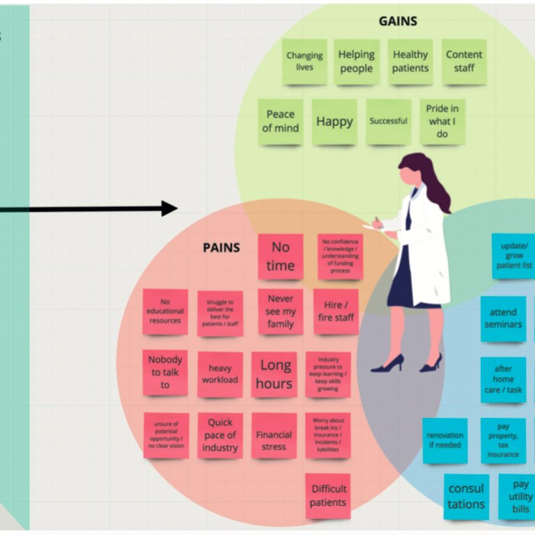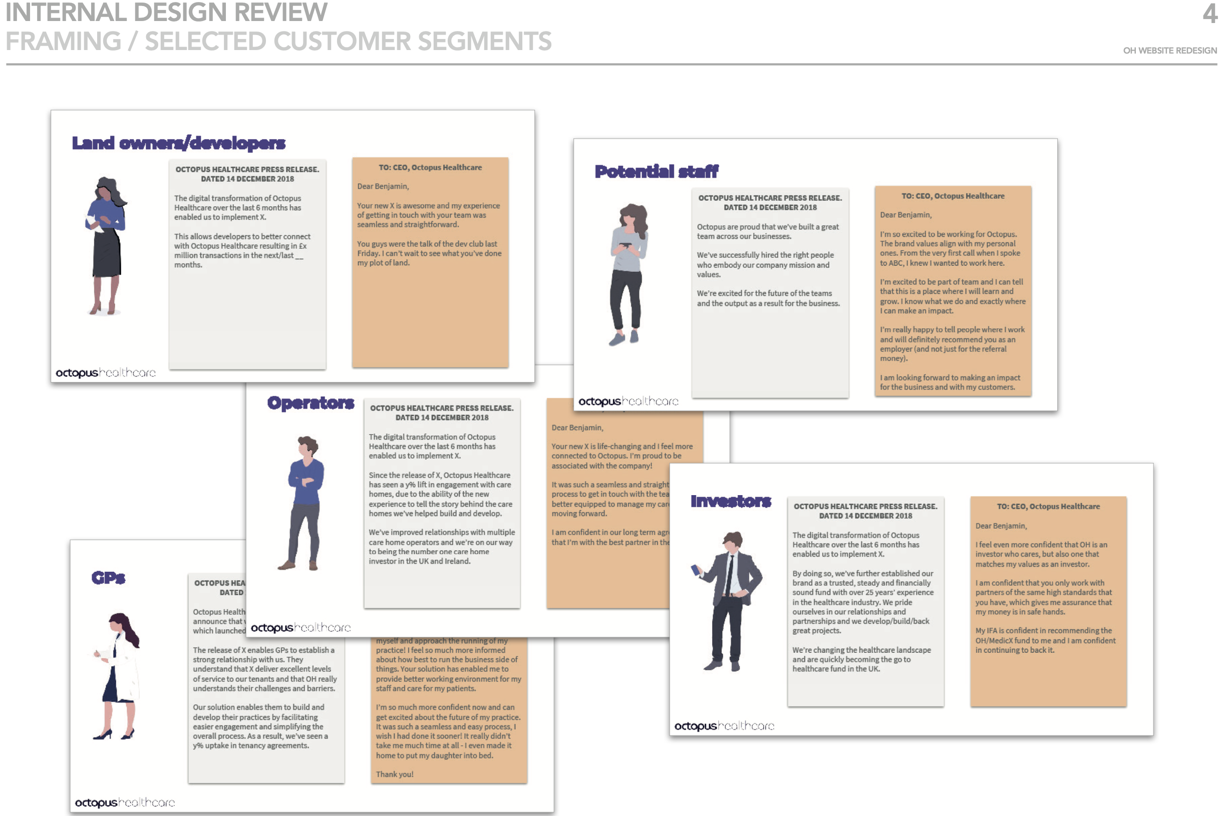 We also revisited previously established Personas. I broke away to do some domain and market research, before rejoining the group to synthesise our learnings through three activities: Pains & Gains, writing Customer Letters and internal Press Releases.